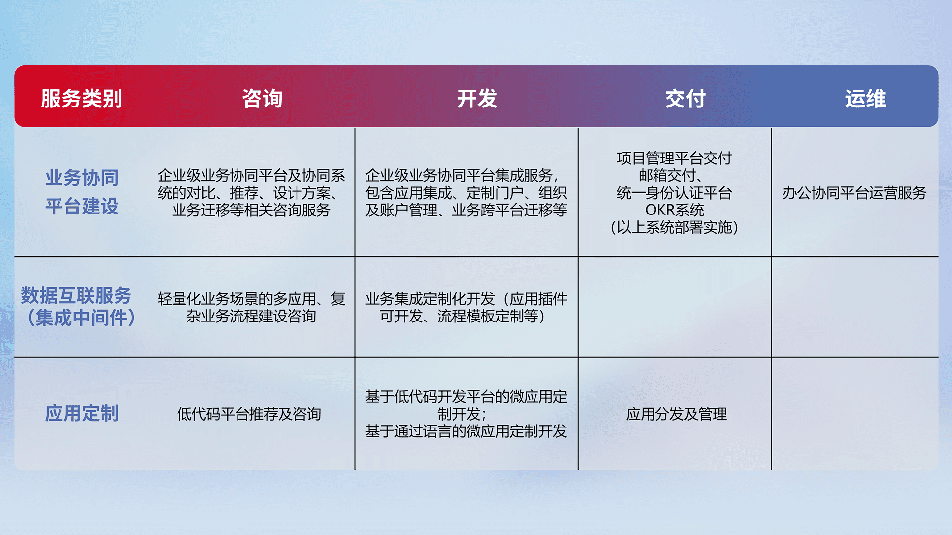 针对钉钉、、、、企微、、IDaas等平台级产品提供产品的规划、、、、方案、、、交付、、、定制化开发等服务,,实现如统一协同办公、、、智能客户服务、、、、混合会议管理、、、、智能数据查询、、等业务场景,,,,实现数字化转型。。。。